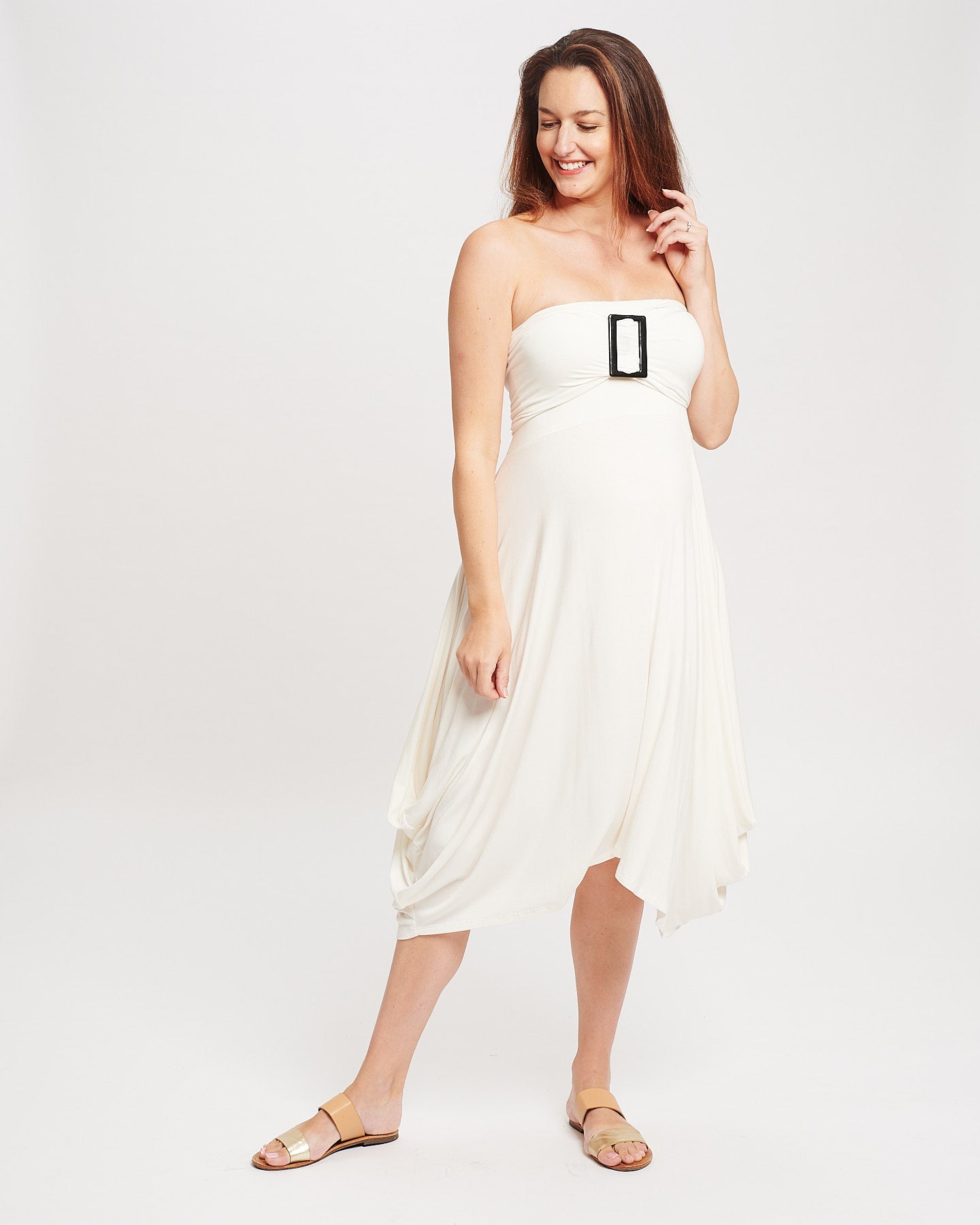 THE Bubz Maternity Wear Dress is manufactured in luxe trans- seasonal easy care (machine washable / no need to iron) plant based fabric. The versatile dress easily converts to 5 or more style ways including tops, skirt, jumpsuit.
